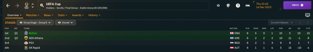 Anelka nicked a 1-0 for a heavily rotated side at home to Rapid then bagged a brace to down PSV 3-1 and take control of the group. However, they also lost Diouf to a broken ankle in that PSV win. But they didn’t let up as Michalik scored the only goal at PSV to win the group with two games remaining. Mahtal fully rotated for the final two group games and they lost to AEK then thrashed Rapid 4-1.