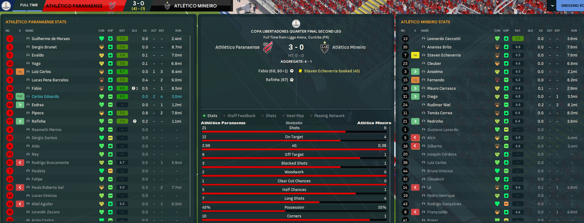 A familiar opponent followed against Atlético Mineiro in the quarter final. The away leg was a drab affair that looked to be going the way of the hosts thanks to a howler by left back Luiz Carlos. But winger Paulo Roberto Aal stepped up, latching on to Fábio’s pass to grab a draw. Back on home ground, Paranaense started brighter and Bracamonte missed a huge chance just before half time. But the game swung on Rasamu’s substitutes. He replaced Bracamonte with winger Carlos Eduardo, who created the opener for Fábio, sprung a counter attack from which Rafinha doubled the lead then laid on another for Fábio. A 4-1 aggregate win sent Paranaense into Rasamu’s first Libertadores semi final.