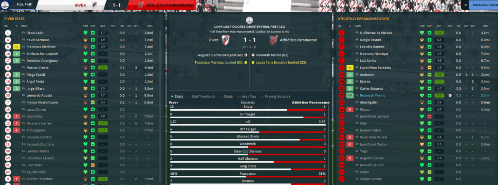 It didn’t get much easier in the quarter final against River Plate. The away leg was first again and Paranaense played terribly, giving up 10 shots and having none in the first half. The second half was a similar story and River went ahead through a fluky own goal. But Rasamu rang the changes and that at least woke the team up before Roameth Merino hit a stunning volley to get an undeserved draw.