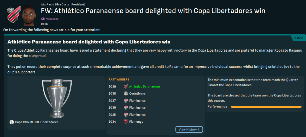 So on 30 November 2039, after 1,611 days at Paranaense and despite the protests of his adoring board of directors, Rasamu resigned. In his 298 games at the club, he won 193, drew 51 and lost 54, scoring 715 and conceding 334, which is fairly skewed by the state league domination. However, he’d have a long wait as the European leagues wouldn’t be available for seven months!
