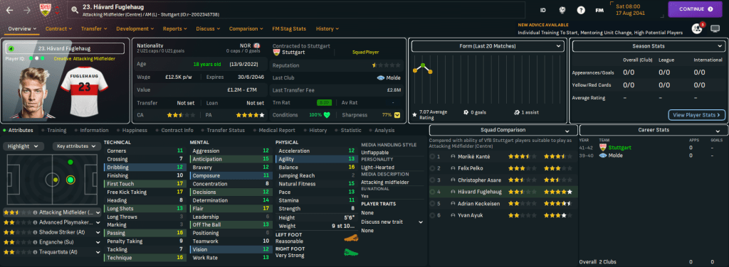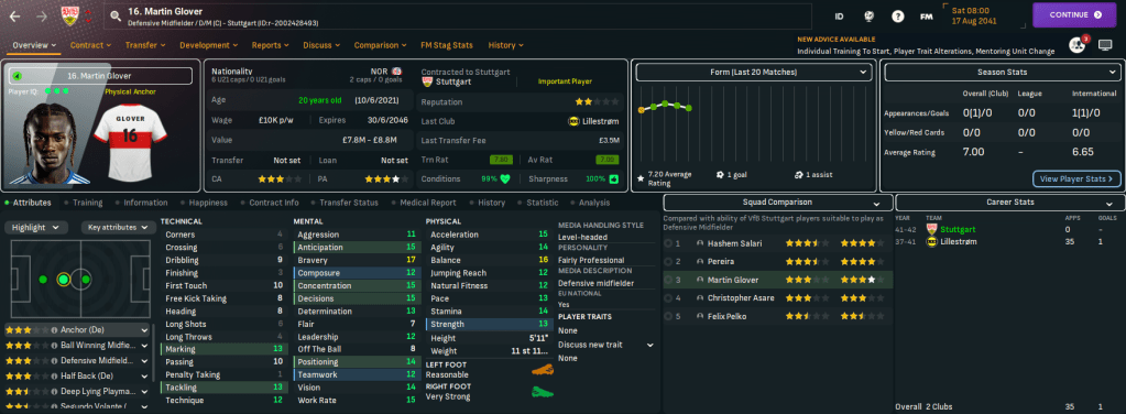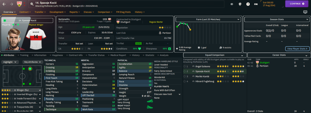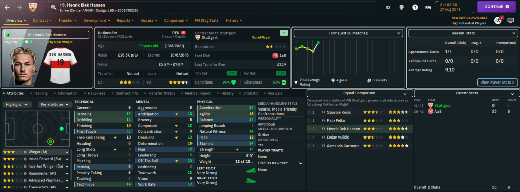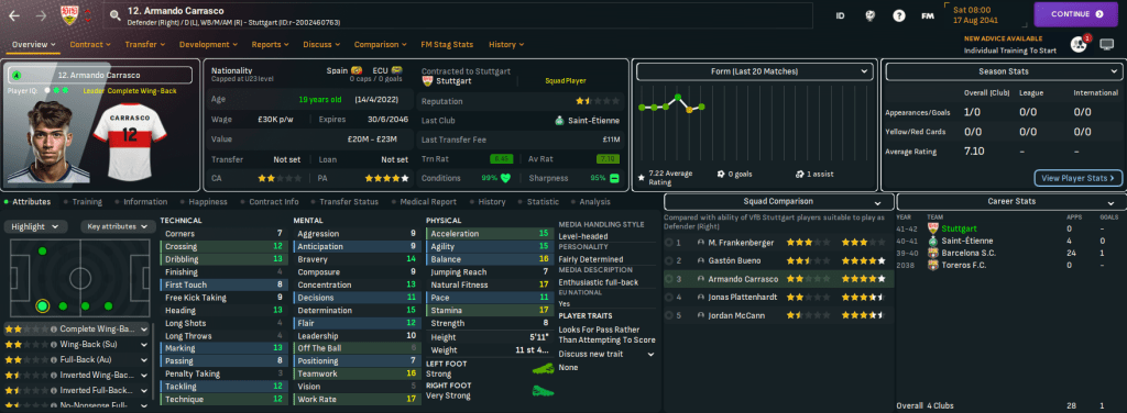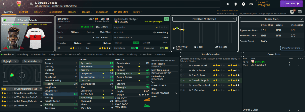 Not one to get too carried away, Rasamu was more focused on strengthening Stuttgart in key areas and bringing a few more of the club’s promising youngsters into the first team picture. He began the summer of 2041 by selling more of the players he didn’t fancy or were too old, raising £20m for eight players. He also made nearly £4m in staff being poached by Dortmund and Leipzig, then replace them with even better staff members!