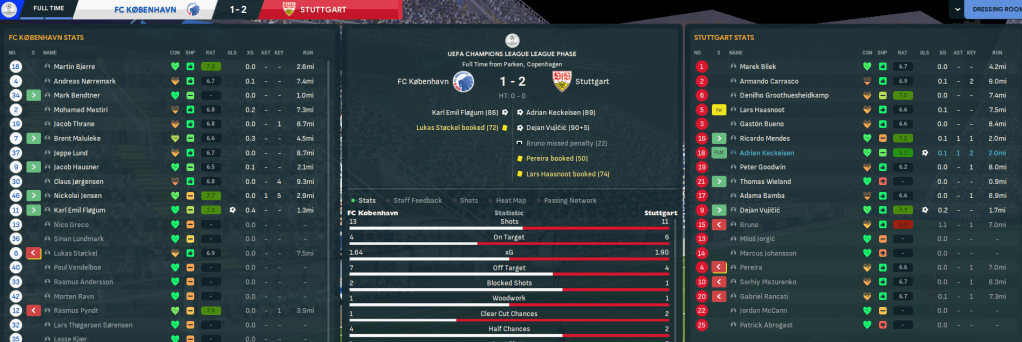 Bruno’s strike just about edged a 1-0 win over Lyon before an entertaining 1-1 at home to Barca and a pretty turgid 1-1 at Feyenoord. They looked to have blown a huge chance at Kobenhavn, who scored in the 86th minute after Bruno had missed an early penalty. But a late show by homegrown midfielder Adrian Keckeisen score an immediate equaliser then lay on the winner for Vujicic. That left Stuttgart sitting in 13th place with two games remaining, one of which was a trip to leaders Tottenham.