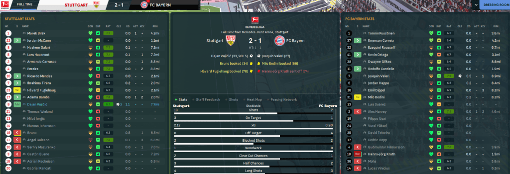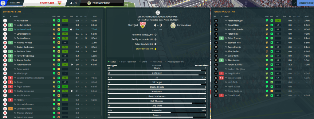 Stuttgart’s Champions League games included trips to PSG and Spurs and entertaining Barcelona. They started by visiting PSG, began brightly before the hosts obviously scored their first shot and lost 2-0. A much better performance, which didn’t take much, came at home to Ferencvaros as centre back Hashem Salari opened the scoring and, 22 shots later, Mazurenko doubled the lead to open the floodgates for a 4-0 victory.