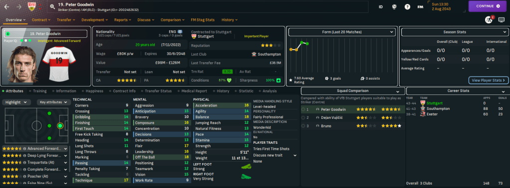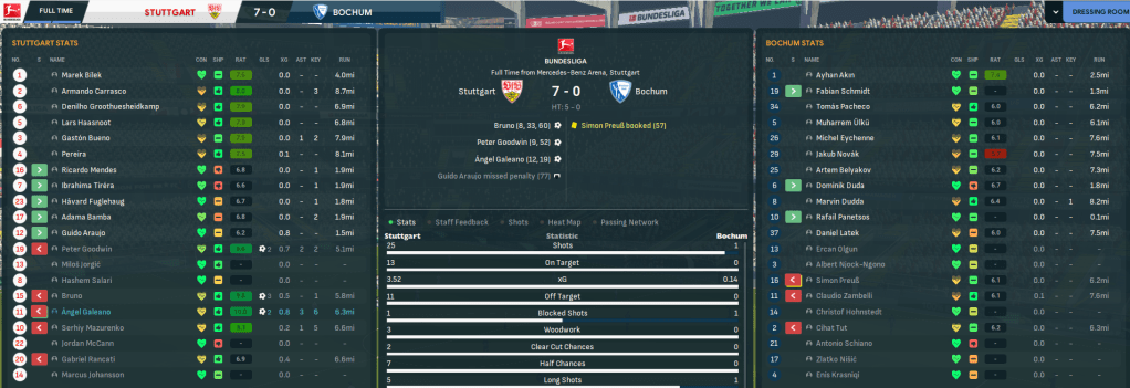 Goodwin hit the ground running in the season opener at home to Bochum, creating the opener for Bruno then latching onto winger Ángel Galeano’s pass to score after 12 minutes. Stuttgart absolutely dominated and Galeano bagged a brace and Bruno followed suit to make it 5-0 inside 32 minutes. Goodwin doubled his tally from an outrageous Galeano cross after the break, Bruno wrapped up his hat trick and they opened the campaign with a new club record 7-0 victory.
