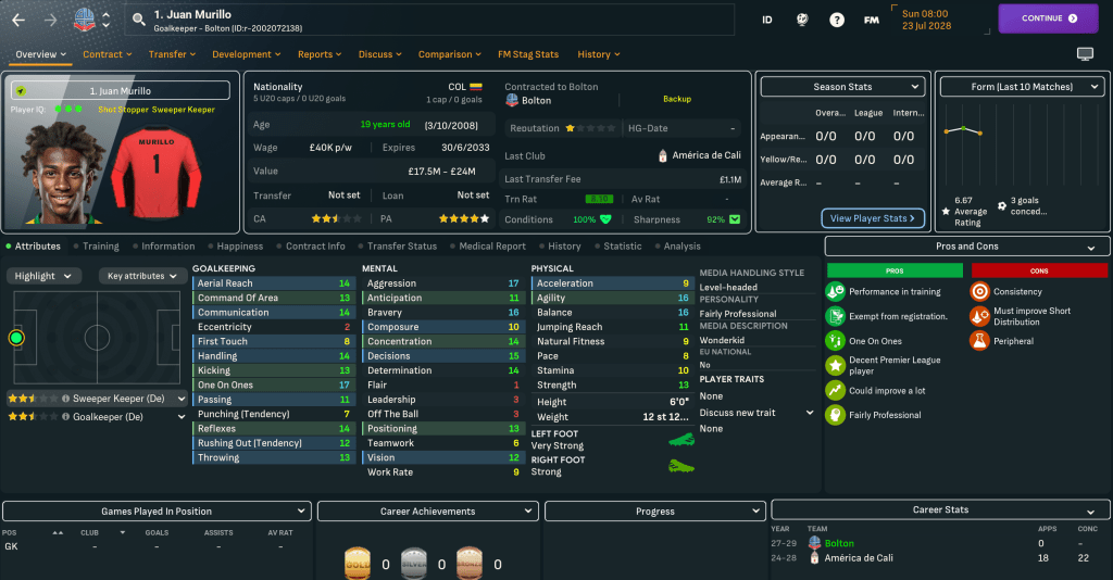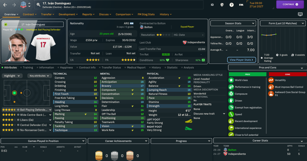 Chelsea again came in with a ludicrous bid for a Bolton player, offering £40m for Kevin Nolan, who struggled to get in the team last season. Mahtal continued his focus on signing promising youngsters by paying a hefty £41m to bring in a 17-year-old Harry Kane from Spurs. He was joined by a monstrous wonderkid, and the first featured newgen of this save, Iván Domínguez for just £2.6m from Independiente and Nolan’s replacement Jack Wilshere for £14m from Arsenal.
