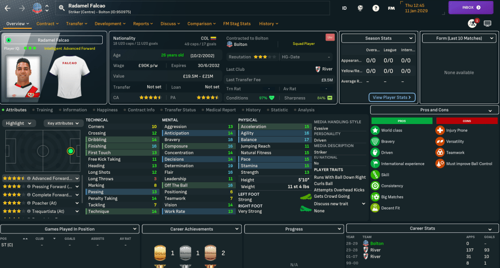 Bolton again cashed in big courtesy of Chelsea, who came in with £60m for winger Jonathan de Guzmán, who was terrible last season. And Mahtal didn’t see too much need for improvement, other than replacing Jussi with Colombian wonderkid Juan Murillo, who joined for £1.1m from América de Cali, who joined exciting 6ft 8in striker Jan Schreier in the first team. Then in January, they added Radamel Falcao to their striker options for £8m from River.