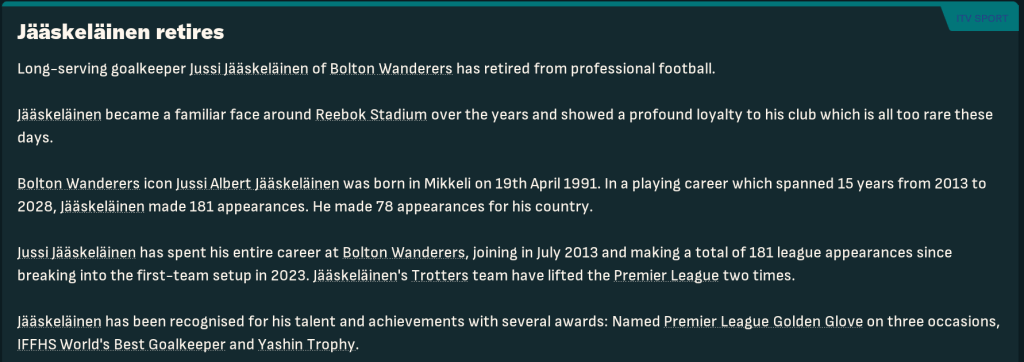 A big blow saw goalkeeper Jussi Jääskeläinen decide to retire at the age of 37. He called it a day after 498 league appearances for Bolton, just 20 short of Eddie Hopkinson’s all-time club record. In Mahtal’s five seasons, he conceded 125 in 181 league games and kept 100 clean sheets. He was also named the best goalkeeper in the world and won the Premier League Golden Glove three times.