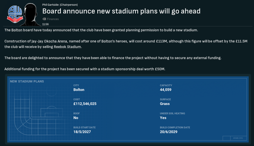 There was exciting news off the field as the Bolton board announced that work on the Jay-Jay Okocha Arena was underway and the new £113m stadium would be complete by the summer of 2029. So we’ll fly through the next couple of seasons to continue with this save before moving into the new stadium.