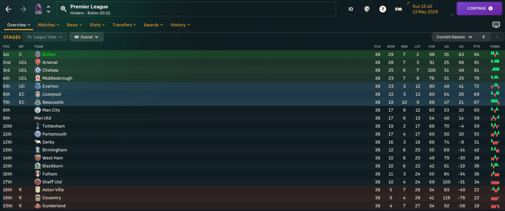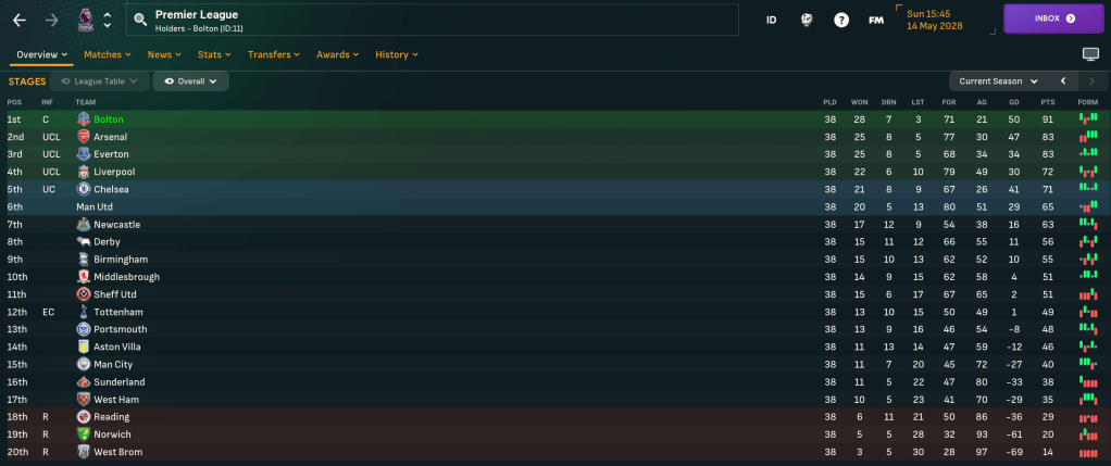 Midfielder Max Noble got the Wanderers back on track with just their second win against Chelsea in 11 meetings. And that proved the catalyst to send Bolton on their way, defending their title with ease by 8 points from Arsenal. They got 91 points, 9 fewer than last season, and only scored 71, which was boosted by scoring 11 in the final two games when Mahtal trialled a more offensive approach, and conceded 21. Chelsea, ridiculously, finished 5th after signing Messi and Nolan, who only played one league game, and loaning out Vaz Té.