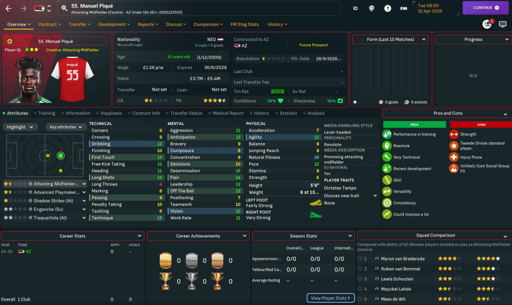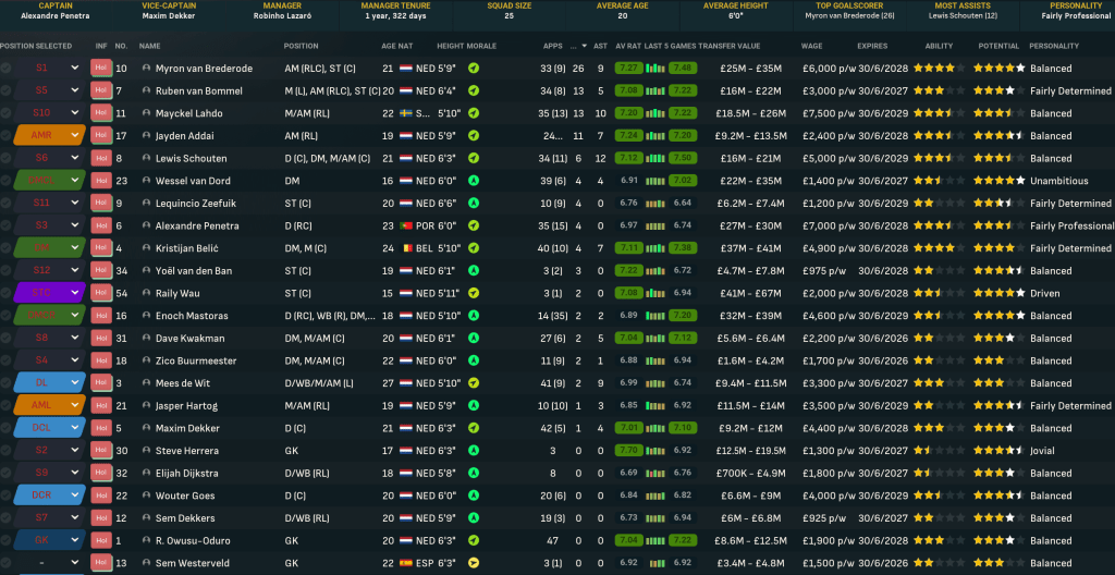 That player development delivered again with another strong youth intake containing two 5-star potential talents, one 4.5-star potential and two 4-star potential. The star player of the intake is striker Raily Wau, who’s potentially even more exciting than last year’s star man van Dord and scored twice on his full debut in a 3-0 win at home to Sparta, along with centre back Franciscus Legros, who suffered a cruciate ligament injury in early May, and attacking midfielder Manuel Piqué.
