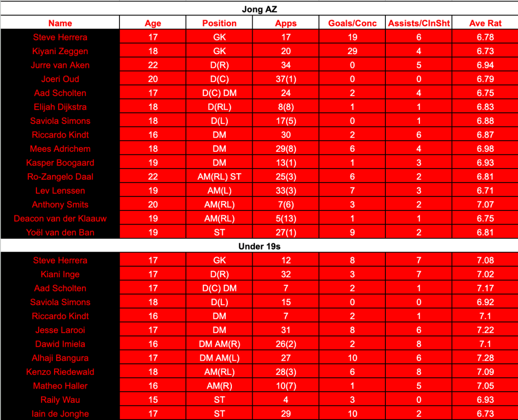 Jong AZ didn’t perform quite as well this season, finishing 15th in Keuken Kampioen Divisie, while the under 18s finished 3rd in their league. Here’s how some of the better performers got on: