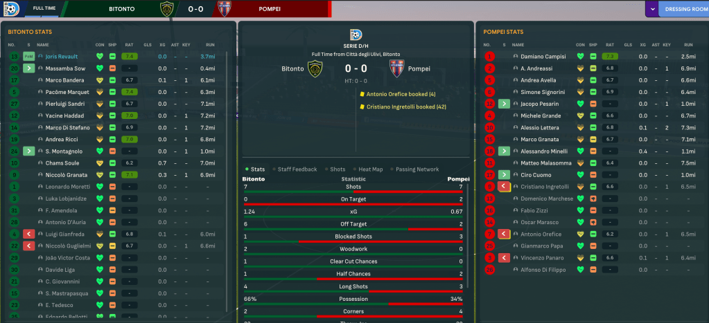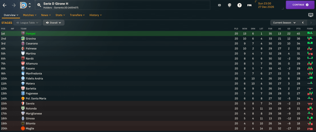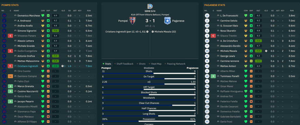 This time they stayed top for longer than a week as they won at Casarano then Ingretolli’s brace led a 3-0 domination of Mariglianese. But they lost goalkeeper Damiano Campisi to a broken arm, which forced 17-year-old Domenico Marchese, who has 4-star potential but is nowhere near first-team ready, into the starting lineup. He faced a baptism of fire as Pompei lost 3-2 on his debut at 6th-place Fasano before making six saves to earn a 2-2 at home to Altamur, five saves as a brace by striker Cristiano Ingretolli downed Barletta 3-1 and kept his first clean sheet as Ingretolli earned a 1-0 at bottom side Ginosa. The young keeper excelled in his biggest tests yet as he repelled most of the 1.3x G that Paganese threw at him while Ingrotelli bagged a hat trick to secure a 3-1 success then kept a clean sheet and earned man of the match with 7 saves to earn a 0-0 at Fidelis Andria.