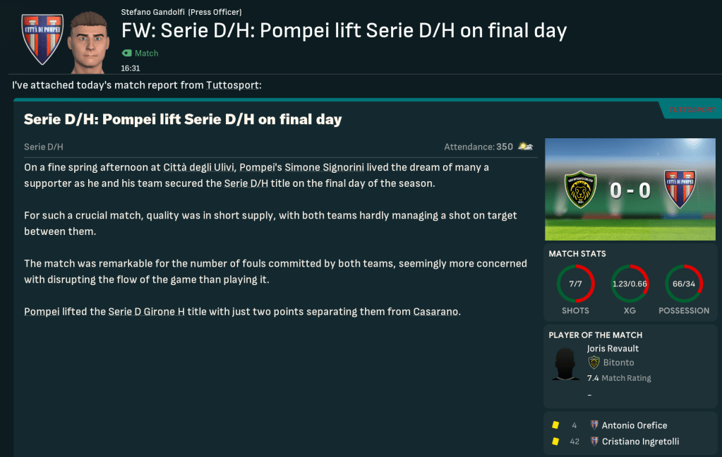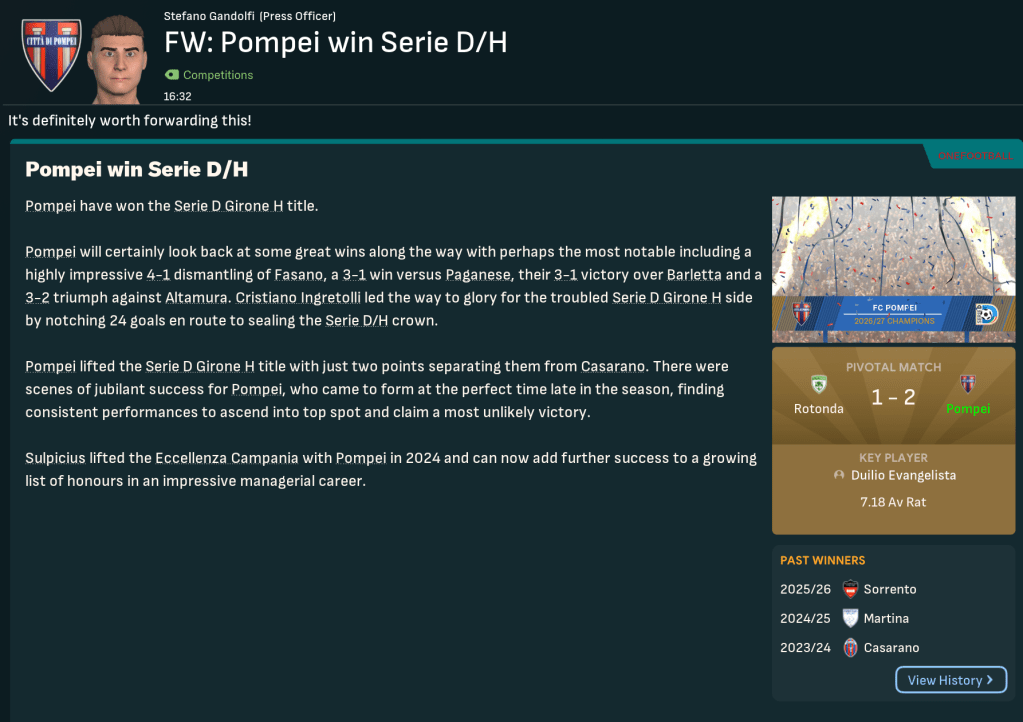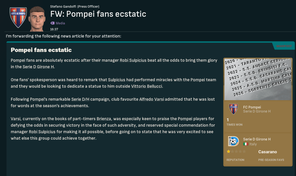 Sulpicius now faced a mammoth task to rebuild his Pompei squad for a tilt at survival in their first-ever season in Italy’s tier three. Join us next Friday to find out how he goes about it!