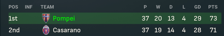 But a 4-2 loss at Matera left Pompei with a five-point advantage over Casarano going into a title showdown and with 2nd place more or less locked down. And they had an odd two-week break between all of their five remaining fixtures.