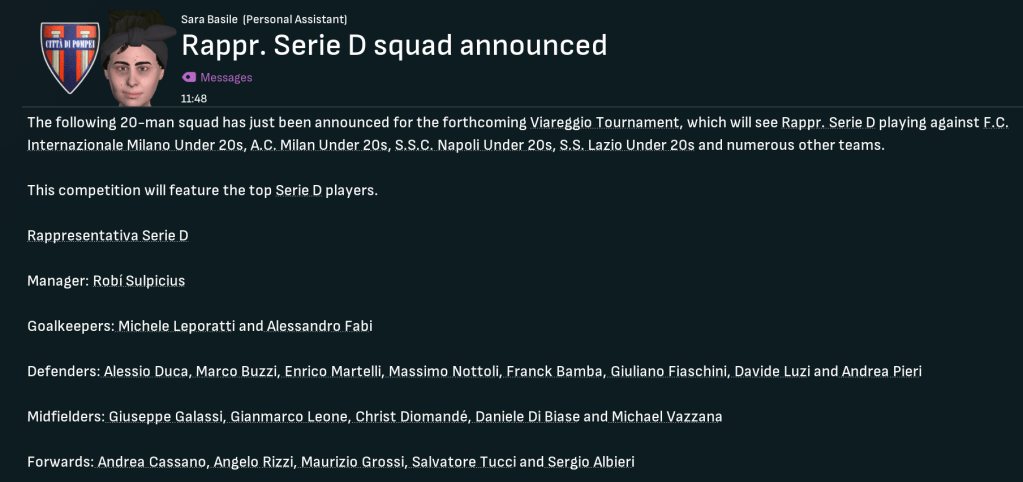 Sulpicius’ efforts hadn’t gone unnoticed this season as he was offered a mass of Serie C jobs and selected to manage the Serie D side for the Viareggio Tournament, in which Serie D’s best took on Europe’s big boys’ under 20s sides in mid-March. They did quite well, considering he had no knowledge of any of the players, drawing 2-2 with Torino and 0-0 with Brøndby either side of beating Dunbeholden 1-0 but exited 2 points behind the Danes.