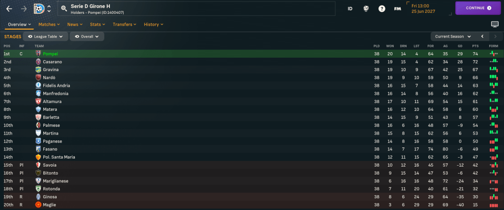 Game 2 – Maglie (20th, home): Next up was a must-win home clash against already relegated Maglie. And they delivered as Malasomma’s early goal settled any nerves before an Ingretolli double wrapped up a comfortable 3-1 win. Casarano drew again, 1-1 at home to Rotonda, to extend Pompei’s lead to 7 points but Pompei lost Evangelista for the title race to a torn hamstring.