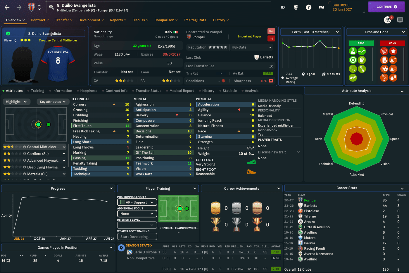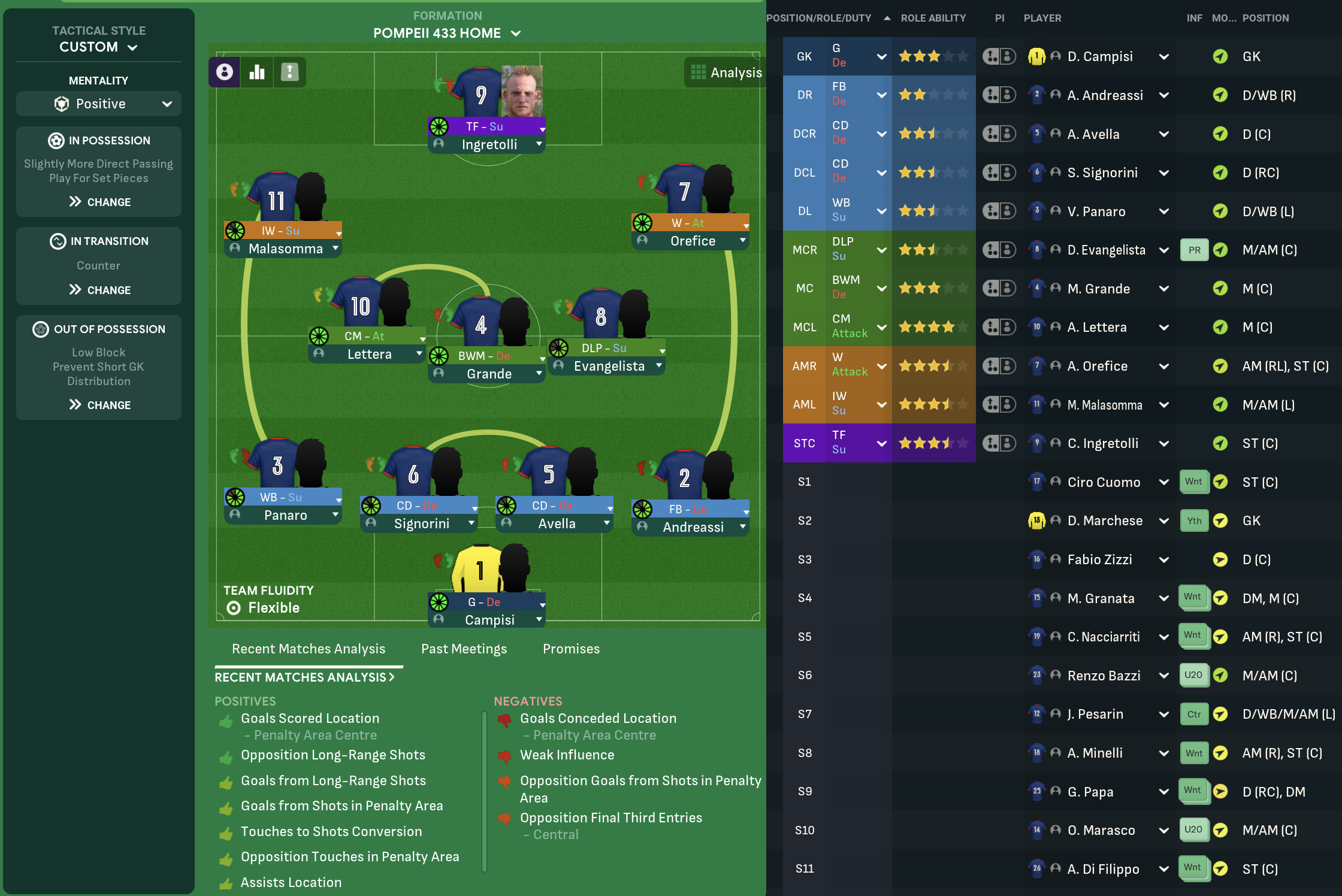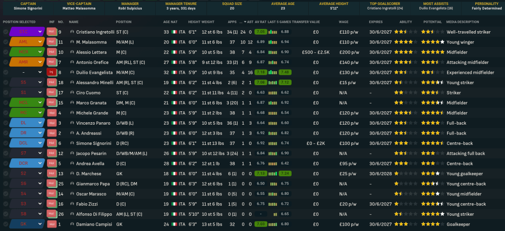 So the manager was again limited to scouring freebies to try and strengthen his squad after captain Vinzenco Carrotta and backups winger Alfredo Varsi and keeper Antonio Mele left the club. And in the end, he only managed to replace Carrotta with experienced midfielder Diulio Evangelista. That was largely as the first 11 was decent for this level and any players better than them either wanted too much money or chose to join other clubs. So they stuck with a familiar lineup with a couple of tweaks in the midfield roles.