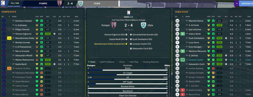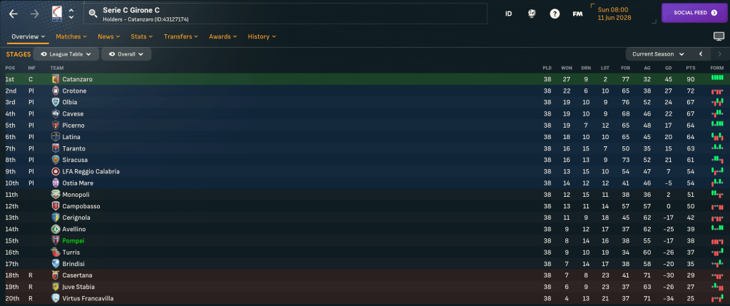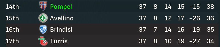 But Avellino won 3-2, which meant Pompei secured survival by 3 points as they finished in 15th place. However, they finished the season with a worrying 12-game winless streak. But, nevertheless, they secured an unfancied survival with 38 points after 8 wins, 14 draws and 16 defeats, scoring 38 and conceding 55, which was only 3 more than 3rd-place Olbia.