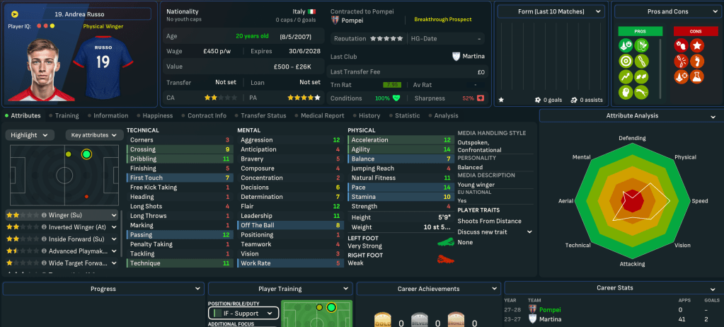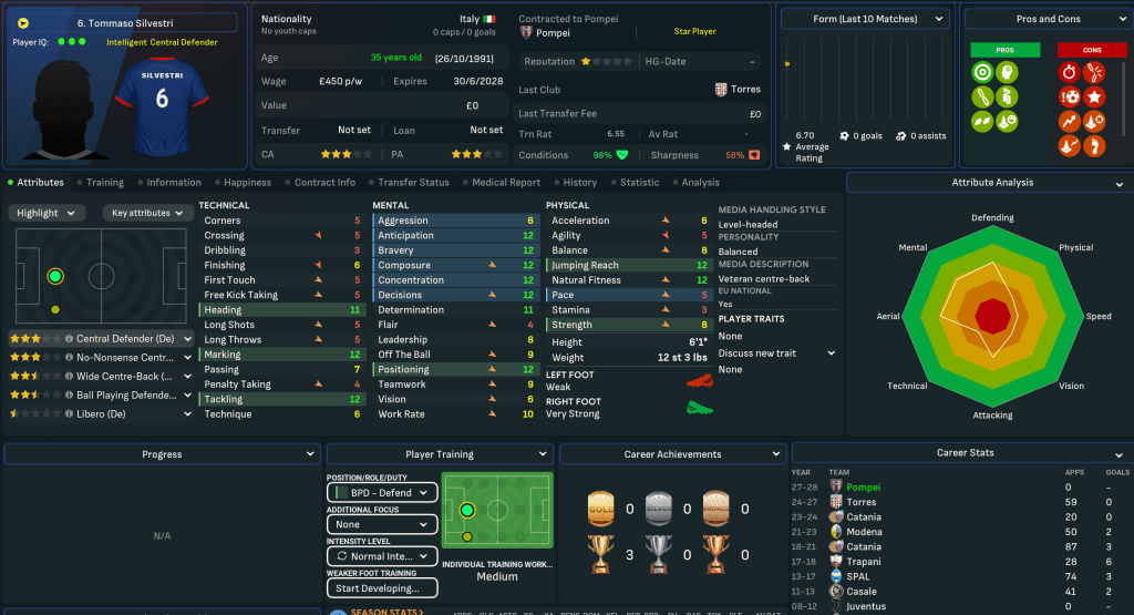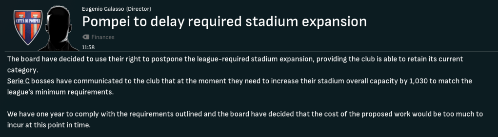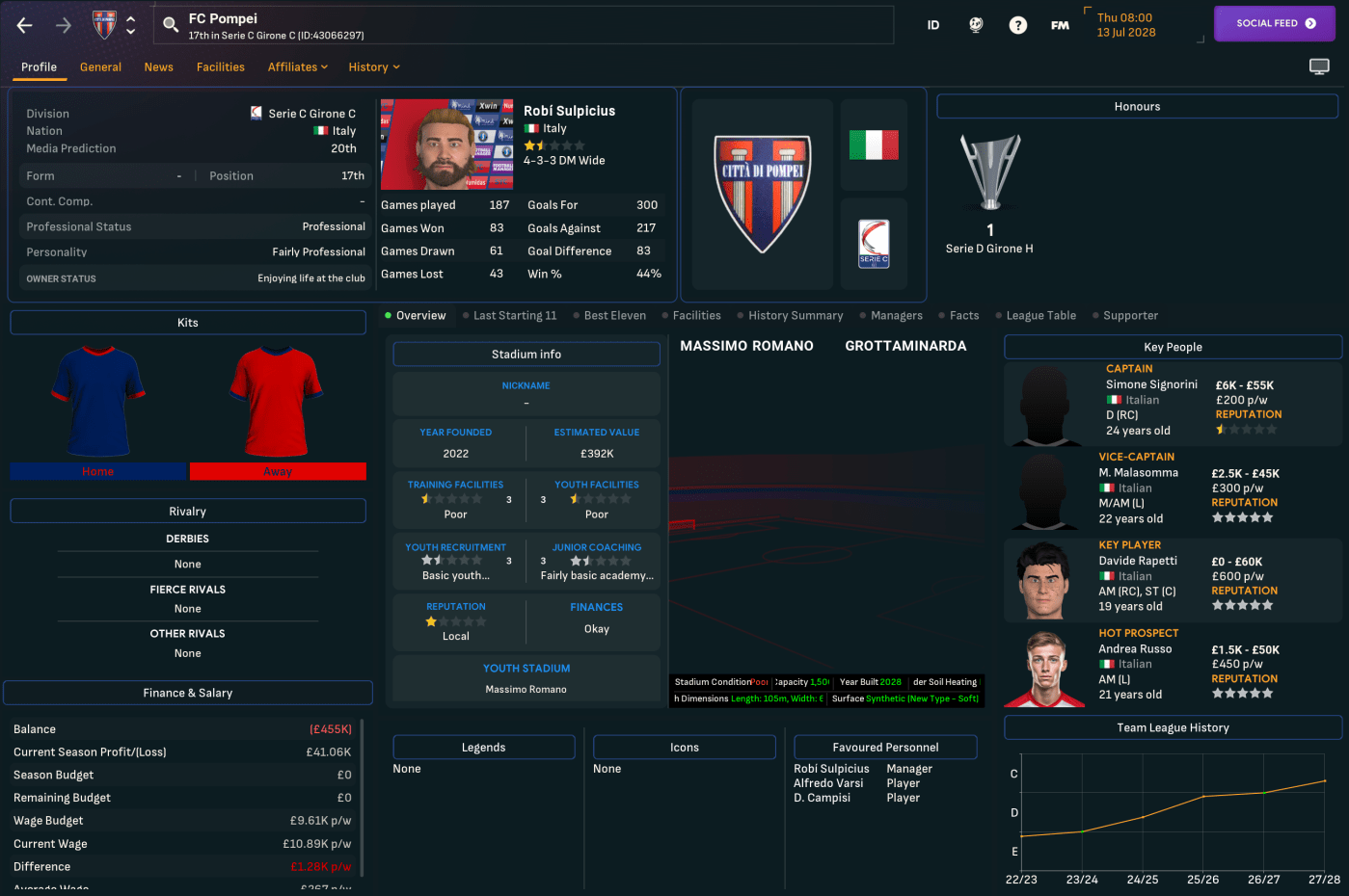 The good news was that the promotion saw the board double the weekly wage budget to £8,400 and give the manager an £11k transfer kitty. However, Serie C requires a minimum stadium capacity of 1,500, compared to Vittorio Bellucci’s 470 capacity, but the club was able to delay expansion by a year. It also has a rule of full-time players having to be paid a minimum of £450 per week, which was nearly four times more than Pompei’s top earner in Serie D – which meant relegation would be absolutely disastrous.