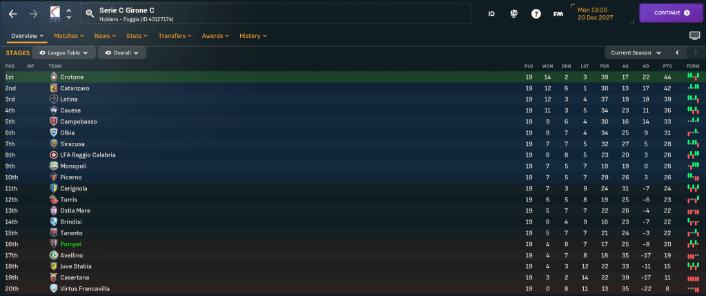 A defeat at Reggio Calabria was followed by back-to-back 1-0 wins at Picerno and at home to Cavese that moved Pompei 9 points clear of relegation trouble. A tricky run followed, including a 2-0 loss at home to Crotone, but with five games remaining Pompei retained a 5-point gap to the bottom five. Pompei’s winless streak extended to 10 as they lost three games in a row 2-0 at home to Latina and Siracusa and, most worryingly, at 19th-place Juve Stabia. But the gap was only reducing to four points with two games remaining.