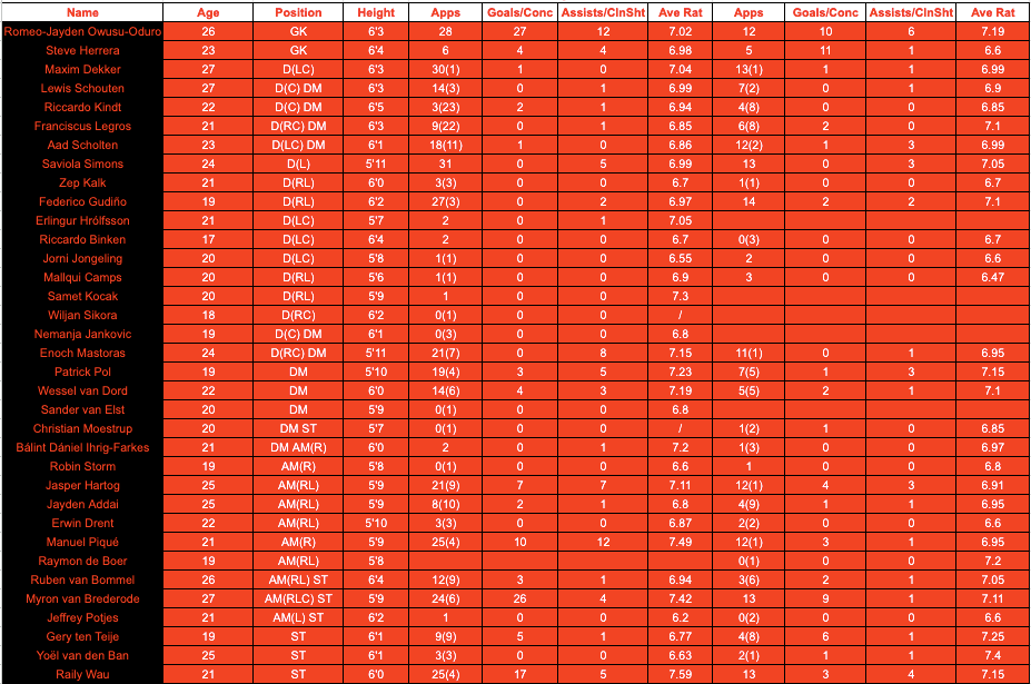 The fully homegrown squad saw some exciting milestones as Mastoras and Aad Scholten made their Netherlands debuts and Federico Guidiño made his Argentina debut towards the end of the season. There was plenty to be excited about with the performances of new squad members Pol and ten Teije. However, the likes of Jayden Addai and Ruben van Bommel had pretty disappointing seasons. The squad played a combined 513 league games, one more than last season, scoring 89 goals with 53 assists, and 255 cup games, scoring 39 with 28 assists.