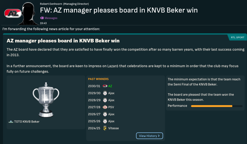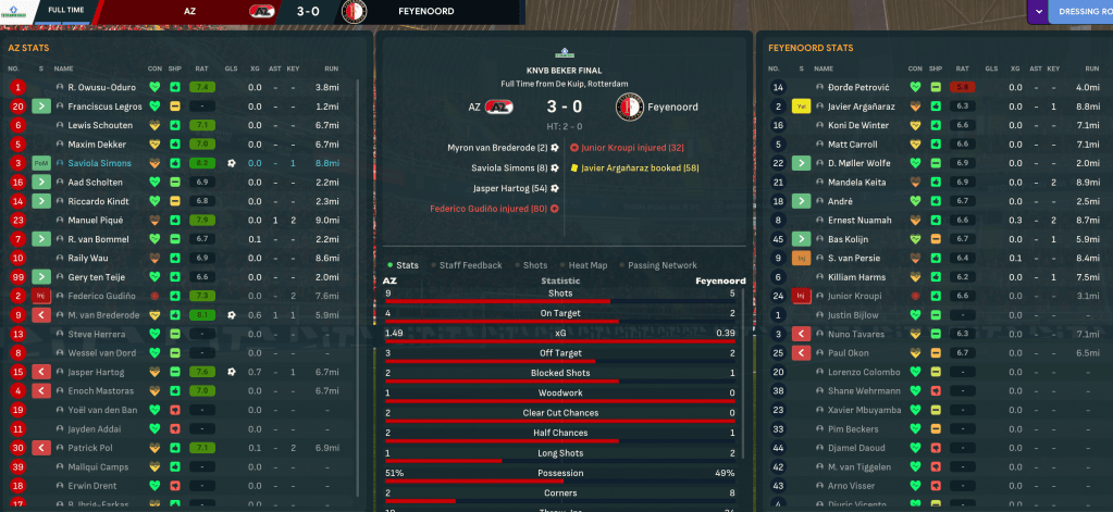 AZ again went all the way to the KNVB Beker Final as a team of backup players defeated Emmen, Cambuur, NAC and NEC. After losing to Ajax 12 months ago, this time they faced Feyenoord, so Lazaró put his first 11 back in. They got a flyer as van Brederode drilled home after 70 seconds and Saviola Simons seized on a loose ball to score his 1st of the season. van Brederode laid on the third for Hartog just after the break and Feyenoord offered nothing. So Lazaró won his first cup competition!