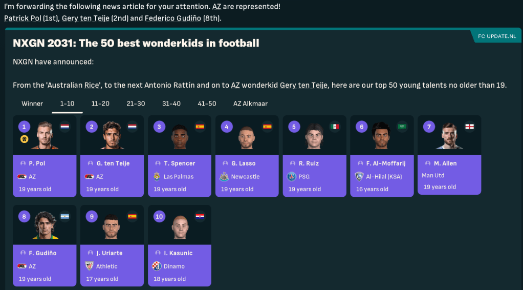 The ongoing promise of AZ’s youth talents was proven by claiming 1st, 2nd and 8th in NxGn 2031. The rapidly improving Pol won it followed by wonderkid ten Teije and right back Federico Gudiño. And there could be even more to come as the latest youth intake delivered two more potential stars in Austrian striker Max Mohr, Belgian/Italian winger Nicola Moscatelli and winger Jeroen Ekkelenkamp.