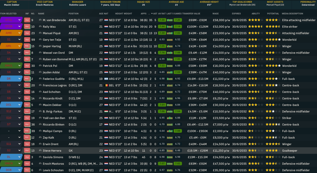 They began 2031 by selling midfielder Tómas Johannesen to Saudi for £20m. But that didn’t disrupt their form as Wau’s hat trick, which ended an 11-hour goal drought, inspired a 5-0 thrashing of Willem II. Fellow superstar in the making Piqué then inspired a 3-0 win at Sparta by scoring the opener and creating the other two for van Brederode. The unbeaten run finally ended with a 2-0 loss at home to Feyenoord. That kept AZ eight points clear and, despite an iffy conclusion to the campaign that included defeats at Ajax and PSV, they eventually cruised to a third successive title and fourth in five years.