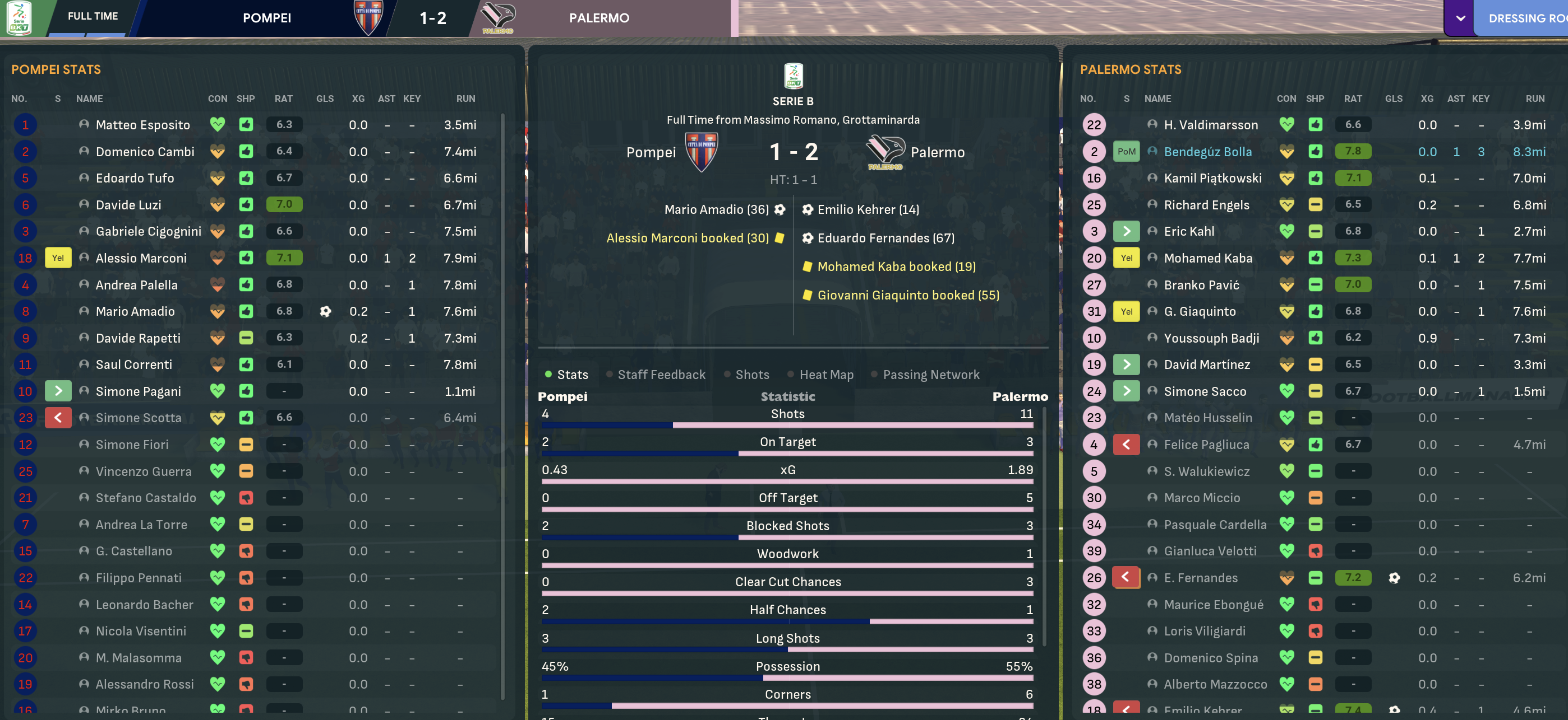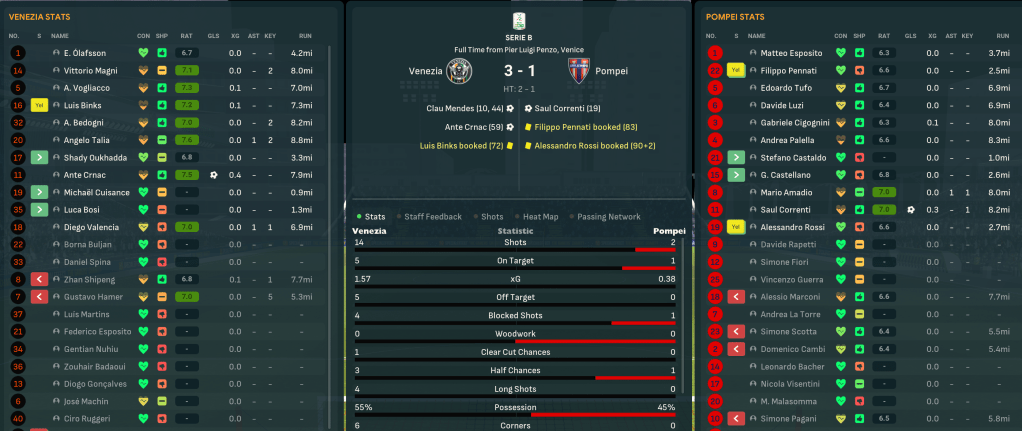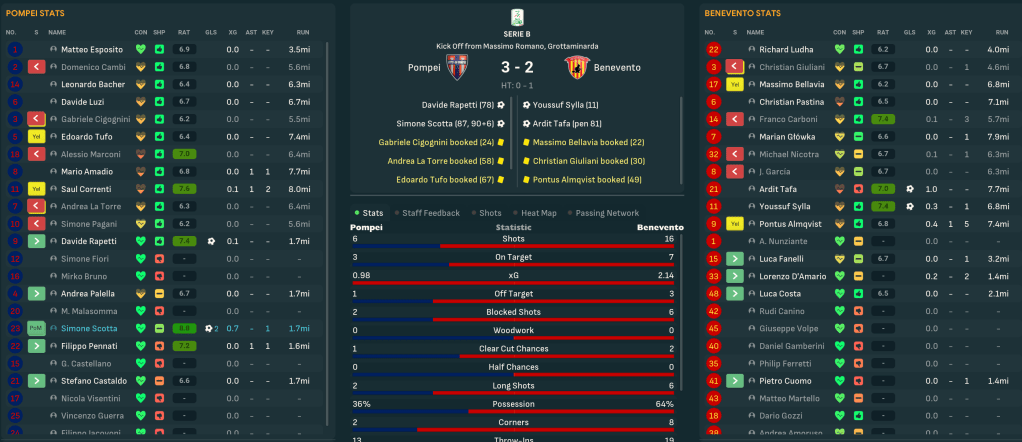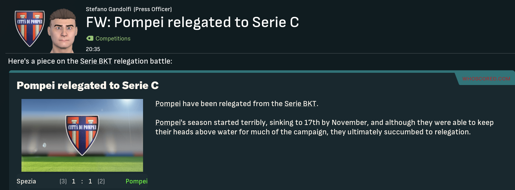 That was because Pompei were thrown into a two-legged relegation ‘playout’ against 17th-place Spezia. The away leg was up first and Pompei were terrible, falling 2-0 down inside an hour before Pagani ended his ridiculous 26-game goalless streak to nick a late consolation with his first goal for the club. Star man Correnti picked up a training injury so Sulpicius took the more attacking mindset with his 4-3-3 approach.