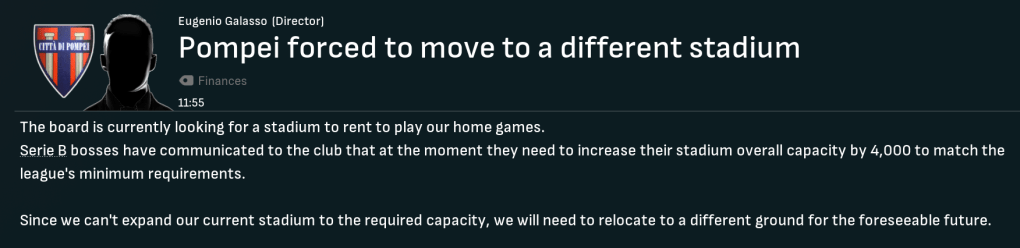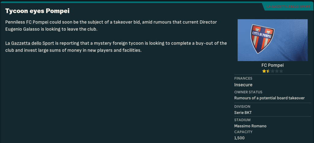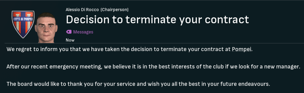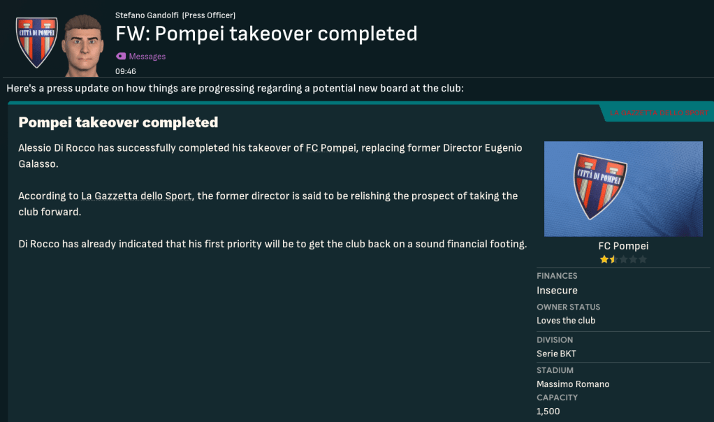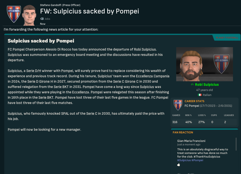 However, the new owner also showed a complete lack of respect to his manager. Remember for a moment that Pompei were given absolutely zero chance of survival by the bookies, and Sulpicius had massively overachieved to finish in 16th. However, Di Rocco called Sulpicius into the boardroom two days after suffering relegation. And, despite him asking for another chance, they ridiculously sacked him as Manager of FC Pompei.
