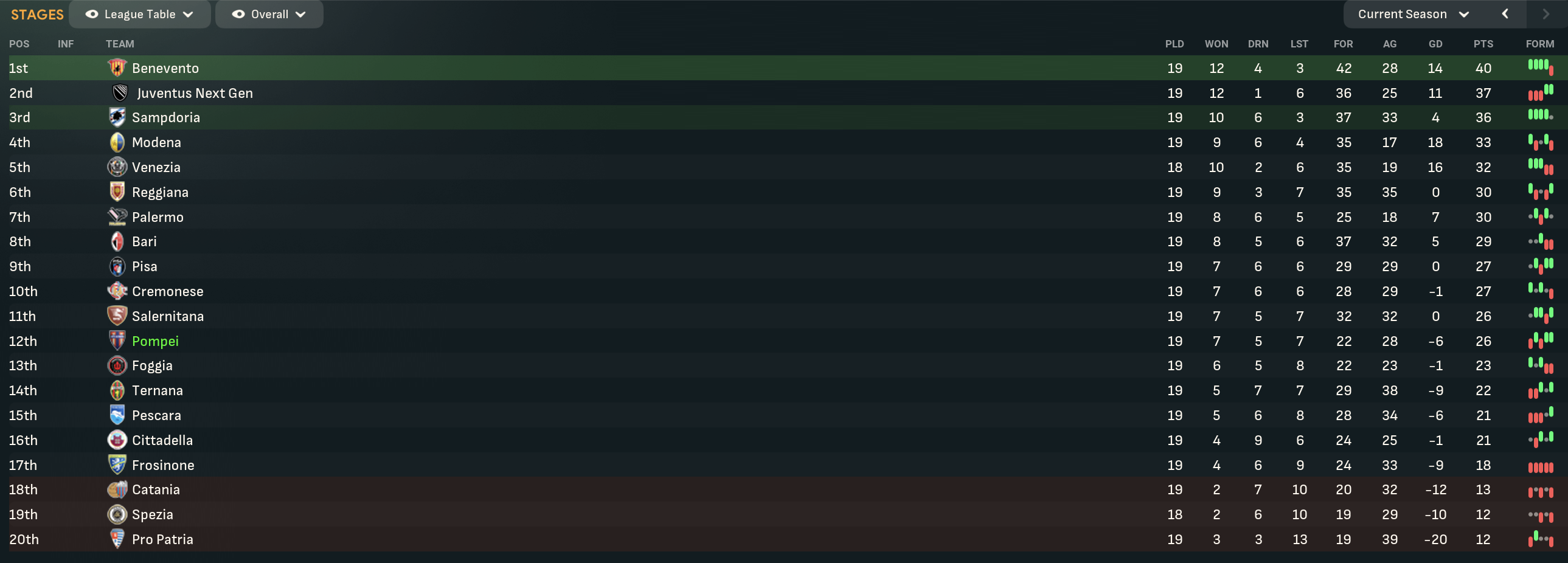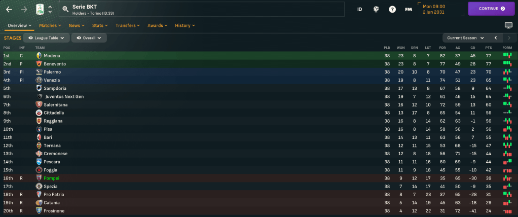 Pompei began 2031 with a narrow 2-1 defeat at Pescara before getting dominated 1-0 by Juventus Next Gen, whose participation in the division feels like a bit of a joke. A tricky run continued with a tough run of games against Pisa, Sampdoria, leaders Benevento and Palermo – and they lost all of them to set a new club record seven successive defeats.