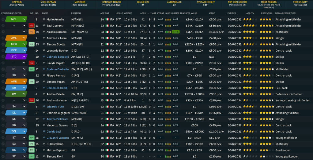 However, the manager maintained his record of still not spending a cent on players. The summer arrivals began with promotion hero Alessio Marconi returning permanently along with fellow midfielders Mario Amadio, Simone Scotta and Giacomo Castellano, who can double up at centre back. They were joined by striker Simone Pagani and winger Andrea La Torre then loan deals for midfielder Andrea Castaldo from Napoli, right back Domenico Cambi from Vicenza and centre backs Davide Luzi and Edoardo Tufo from Frosinone. (Note: I was on a plane writing this and apparently forgot to take player screenshots!)