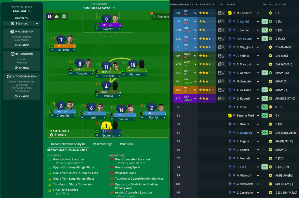 Sulpicius had ended up with an overload of midfielders, so devised a new approach that slightly mixed things up with a more conservative, unconventional-looking narrow 4-5-1. He’d likely jump between that and the 4-3-3 and, while nobody would have any hope for Pompei, Sulpicius trusted the core of players like Marconi, attacker Davide Rapetti, centre back Leonardo Bacher and keeper Matteo Esposito.