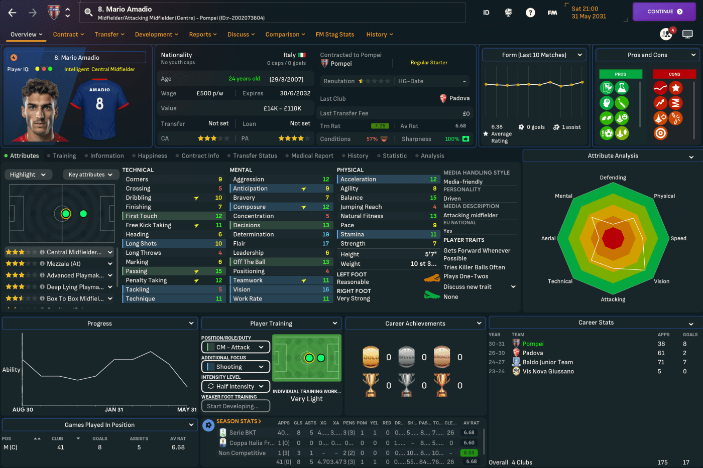 Their promotion created an unusual situation as Pompei’s temporary home Massimo Romano was well below the minimum Serie B capacity of 5,500. However, they were only 12 months away from moving into their new 12,875-capacity home Pompei Stadium. Despite promotion, the club still only had a 1-star reputation, below even some tier-five clubs, and its bank balance was £600k in the red. Furthermore, their financial situation hadn’t allowed them to make any improvements to the club’s infrastructure in the last seven years – which meant their facilities and youth recruitment were all just 3/20.