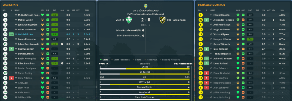 Mahtal began his career with a massive game as VMA IK entertained 12th-place Hässleholms IF, who they only trailed on goal difference. But the first game showed Mahtal just how big a challenge they faced, as they conceded inside 10 minutes, were very lucky to go 2-1 up through a penalty and an own goal, got battered for 40 minutes and eventually conceded after 87 minutes – but at least he started with a lucky point.