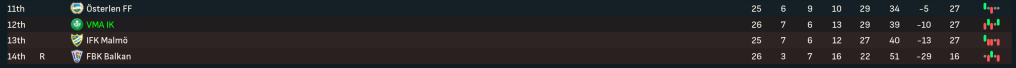 Game 4 – FBK Balkan (14th, away): VMA visited Balkan the day before Österlen hosted 5th-place Rosengård and Nosaby visited Hässleholms IF, which was odd. VMA were handed a huge chance as right back Melker Lundin won a penalty on 8 minutes and… Nilsson converted. Holmquist doubled the lead with a sumptuous strike on the verge of half time to have them looking comfortable. Mahtal wanted more goals but they were terrible in the second half and gifted Balkan a penalty of their own. That gave VMA a chance of survival, they just needed Malmö to lose and Österlen to lose heavily.