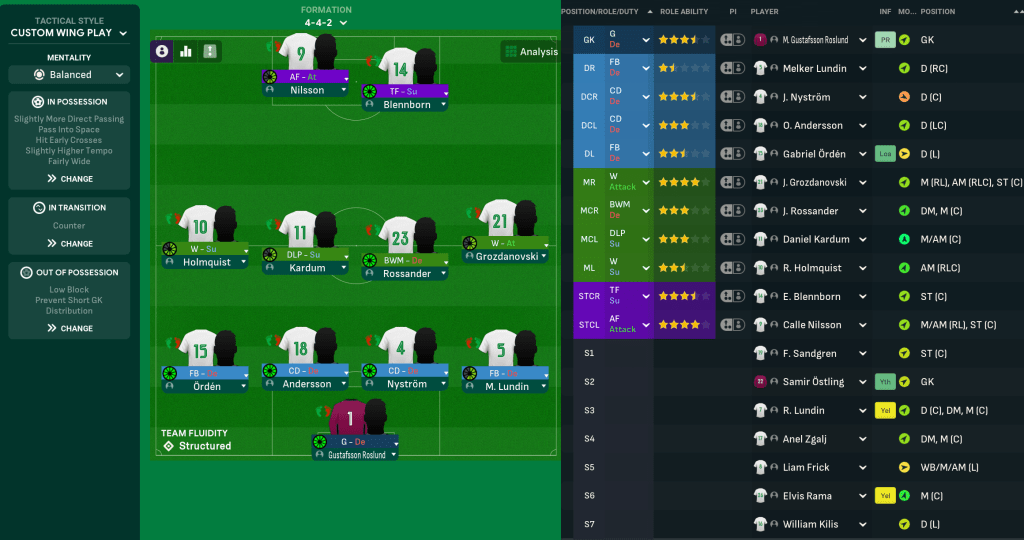 To achieve that, Mahtal would be looking to star player Calle Nilsson, who’s actually got a 7.16 average rating so far this season. Other key players will be attacking midfielder Julian Grozdanovski, striker Elliot Blennborn, centre back Jonathan Nyström, midfielder Daniel Kardum, goalkeeper Max-Ludwig Gustafsson Roslund and young defender Oliver Andersson. And having assessed the players available, Mahtal initially opted for a fairly basic 4-4-2.