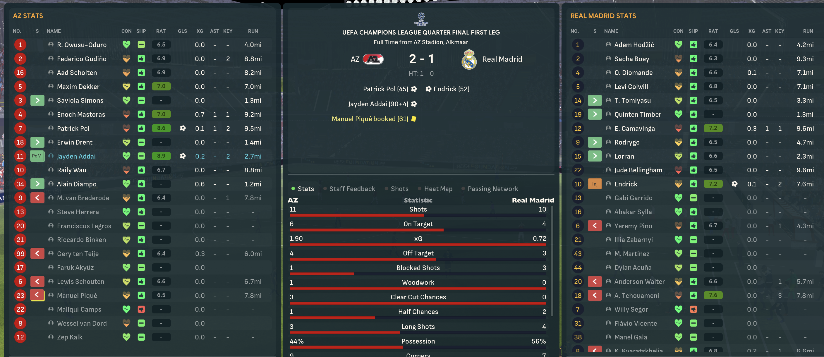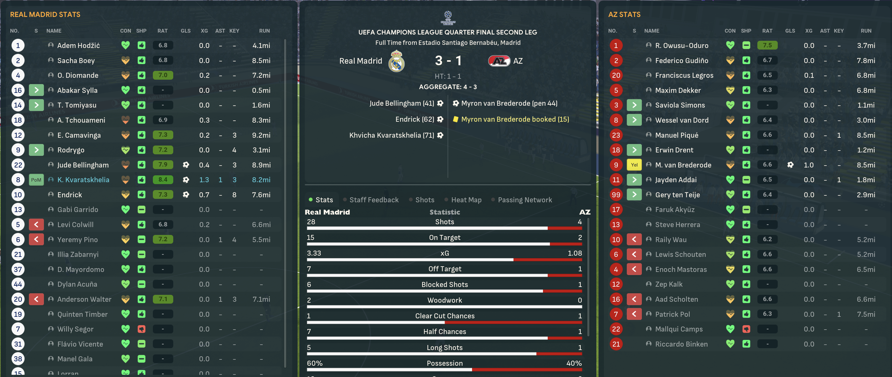 AZ’s reward was to take on Real Madrid. They started the home leg under pressure but, when Pino was taken off by the physio, they pounced as Enoch Mastoras squared for Pol to steer home from 20 yards. van Brederode missed a huge chance just after the break and was made to pay as Endrick coolly finished a one-on-one. Both sides missed chances and it looked to be heading for a draw but, deep into injury time, Diampo crashed a shot off the post, the ball bounced out to Pol and he put Addai through to secure a massive 2-1 win. Madrid unsurprisingly dominated the second leg but missed loads of chances and forced several great saves out of Rome-Jayden Owusu-Oduro. They eventually scored through Bellingham only for Piqué to win a penalty that van Brederode converted. AZ held them off but the pressure eventually told as Endrick was somehow unmarked from a corner and they won 3-1. So the Champions League remained elusive with another narrow quarter final defeat to Europe’s big boys.