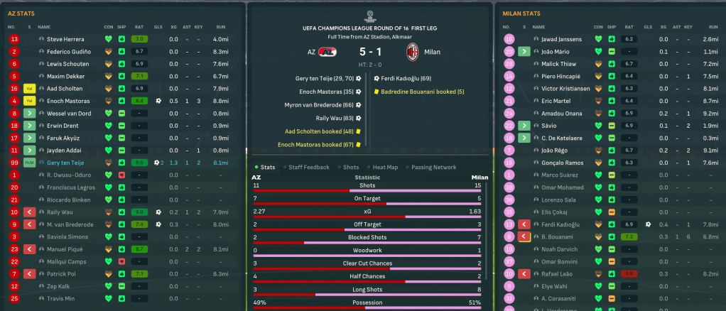 They got a horrible draw in the playoff against Italian champions Juventus, but Piqué and Patrick Pol earned a 2-2 in Italy before van Brederode’s first-half strike edged a 1-0 win at home. Another Italian opponent followed as AZ took on Milan in the last 16 and AZ put in arguably the best performance of Lazaró’s reign to blow them away in the first leg led by a superb ten Teije performance. And an entertaining 3-2 defeat in Italy sent them into the quarter finals for just the second time.