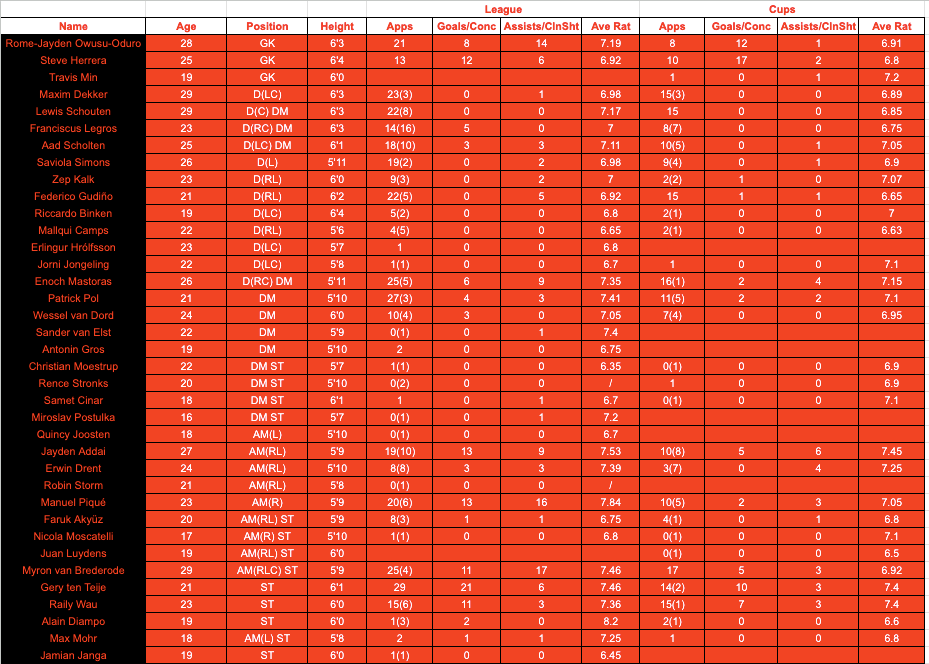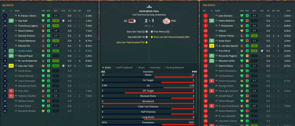 For the first time since the very first season of this save, van Brederode wasn’t AZ’s top scorer. His 16 goals was usurped by the impressive ten Teije’s 31 followed by Wau (21, even though he scored once after February), Addai (18), Piqué (18) and Mastoras (8). van Brederode did lead the assists though with 22 followed by Piqué (19), Addai (16), Mastoras (13) and ten Teije (9).