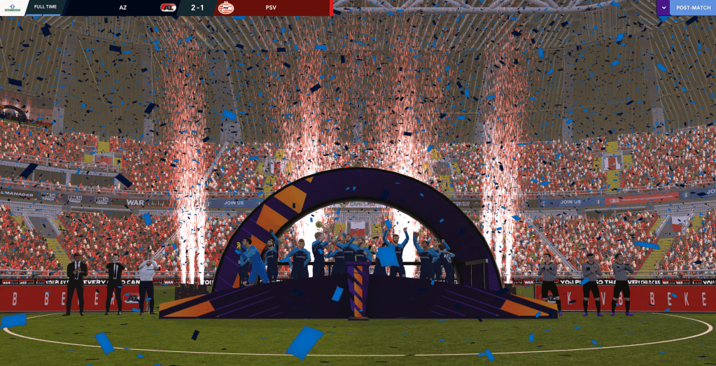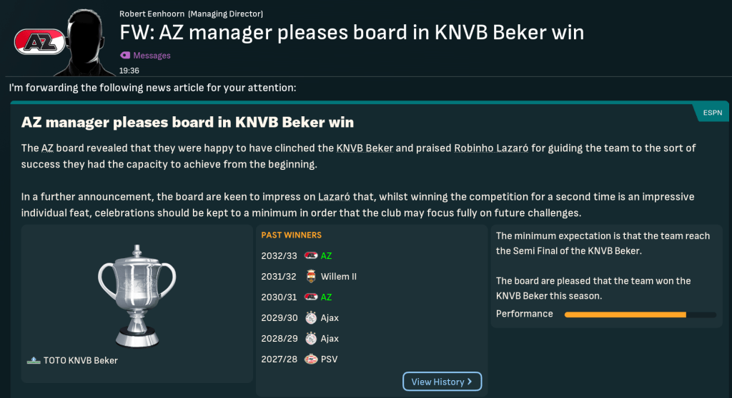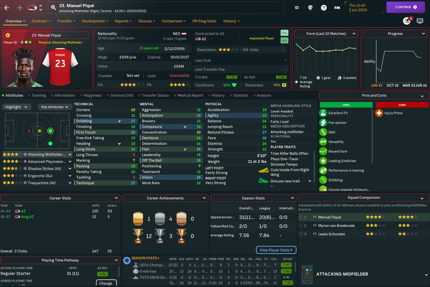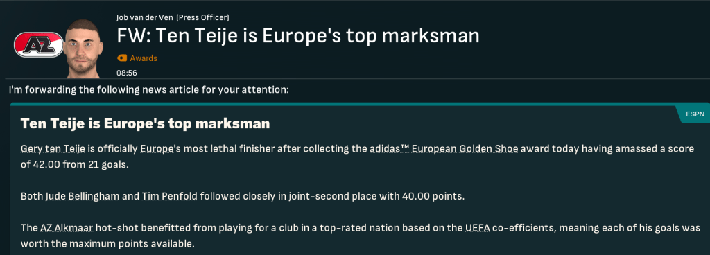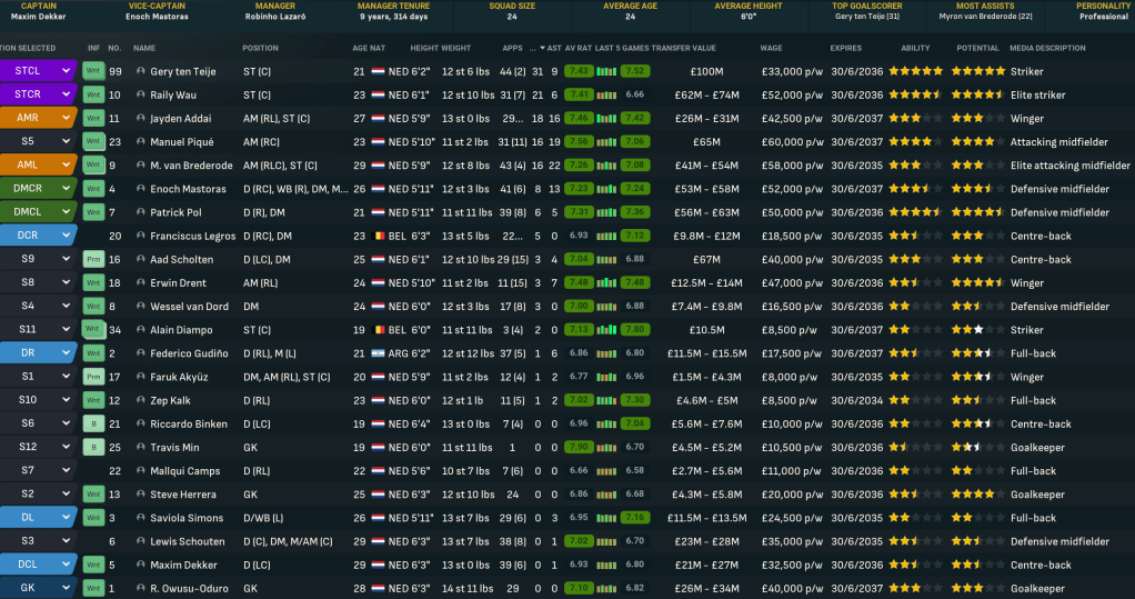 AZ Alkmaar were well and truly dominating in the Netherlands, but Lazaró’s aim to become European Champions with a fully homegrown squad was proving much more problematic. They received another mass of derisory bids in the summer of 2032, including Man City only offering £70m for Raily Wau when they rejected £160m bids the previous summer. And in mid-June, 20 of their 22 first-team players were wanted, but the manager saw absolutely no point in selling.