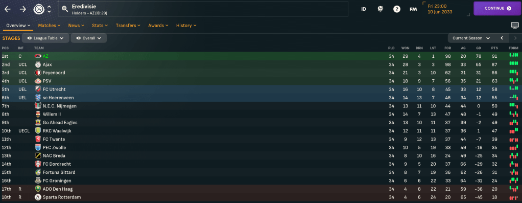 We may be nearing the end of this challenge as some of our better players edge towards their 30s and the dreaded negative transfer balance curse struck in the summer. But we’ll give it at least one more season to see how AZ’s homegrown charges far in 2033/34.