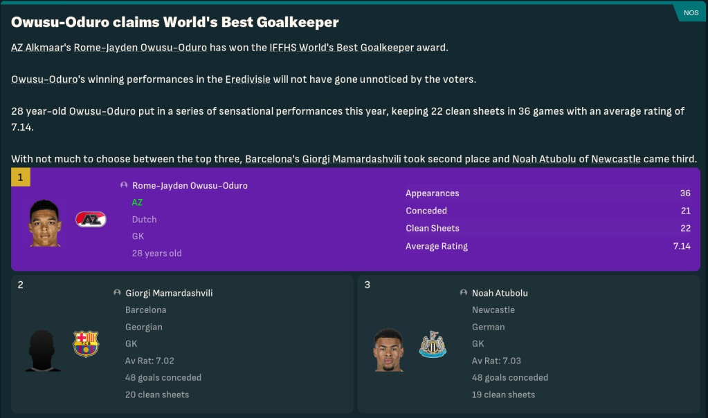 There was recognition for AZ’s academy products as Wau came 2nd in the World Player of the Year and Owusu-Oduro won World Goalkeeper of the Year. And ten Teije followed in the footsteps of Pol and Wau by winning European Golden Boy then won then European Golden Shoe.