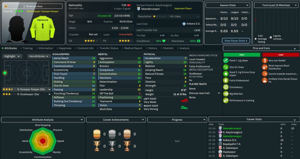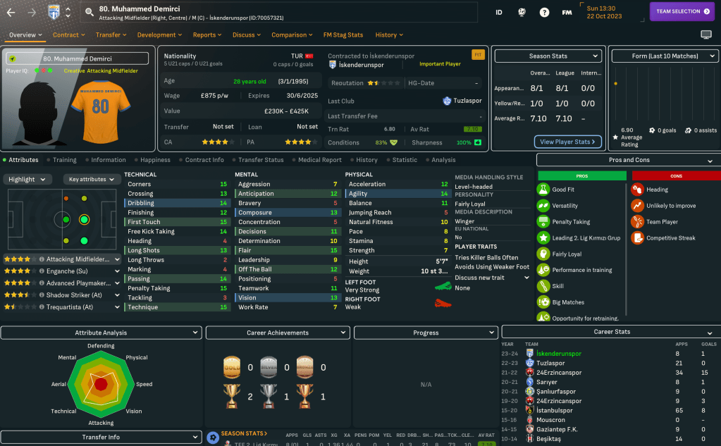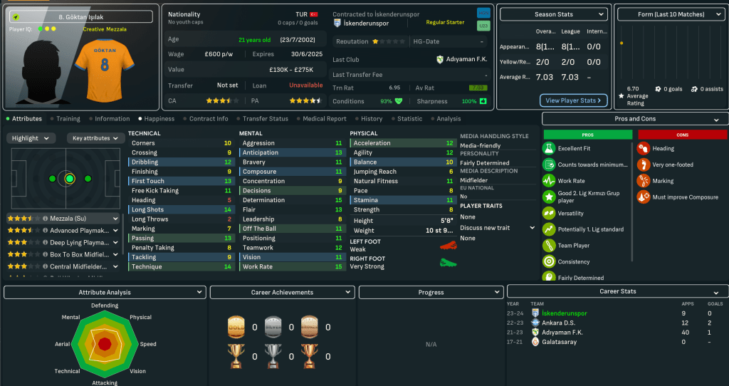 The club offers slightly improved facilities with 6 youth facilities, 5 junior coaching, 3 training facilities and 1 youth recruitment, with a 2-star National reputation. And it plays at the 12,390-capacity all-seater Ískenderun 5 Temmuz Stadyumu. But Mahtal walks into another potential relegation fight as, nine games into their 36-game season, Ískenderunspor are three points clear of the relegation zone in 12th place. However, the media have tipped them to finish 7th.