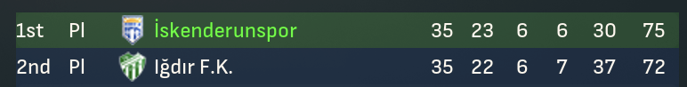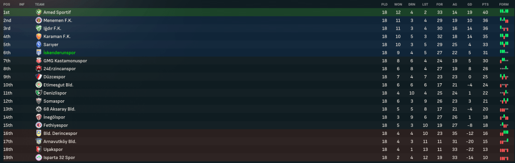 A 2-2 at 3rd-place Igdir while Sportif drew with Denizlispor saw the top five separated by just three points after 24 games. And a 2-0 win at home to 9th-place Sariyer took Ískenderunspor top of the league for the first time. The leading pack jumped around over the next few games but a 1-0 loss at 24Erzincanspor dropped them to third and maintained the three-point gap between the top five with six games remaining.