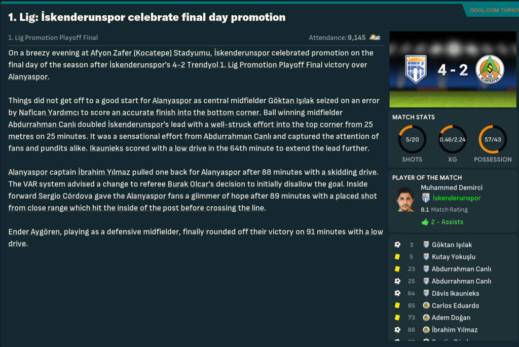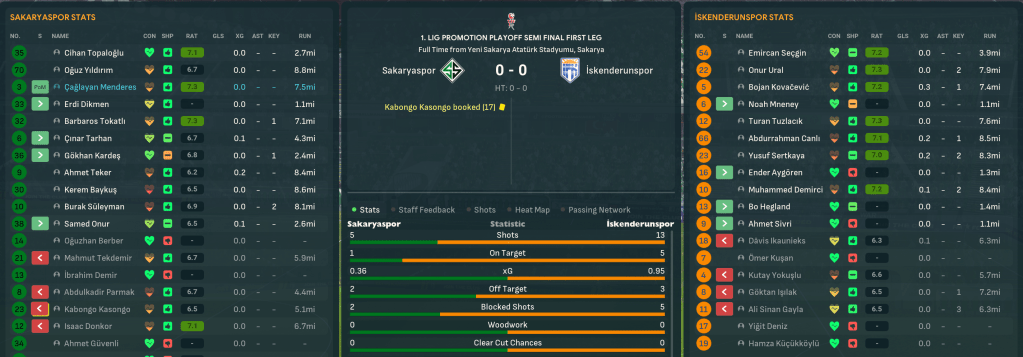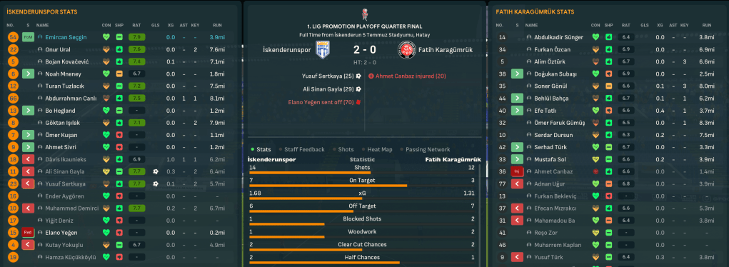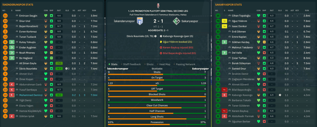 Ískenderunspor entered the playoffs with a quarter final at home to 6th-place Fatih Karagümrük. They started the game on top and took advantage as Sertkaya swept home a delicious curling effort from 25 yards and Gayla quickly doubled the lead. An idiotic red card but them under unnecessary pressure but a solid defensive effort secured a 2-0 win. That took them into a two-legged semi final against Sakaryaspor, who finished 7th. The away leg was a pretty terrible game that Ískenderunspor certainly should have won but a squad depleted by injuries laboured to a 0-0. They then started the home leg poorly, giving away a penalty after 14 minutes but Ikaunieks swiftly levelled things up. The big striker missed two big chances but made up for it by turning and firing his side in front on 76 minutes, which earned a 2-1 success.