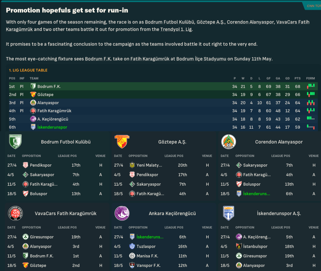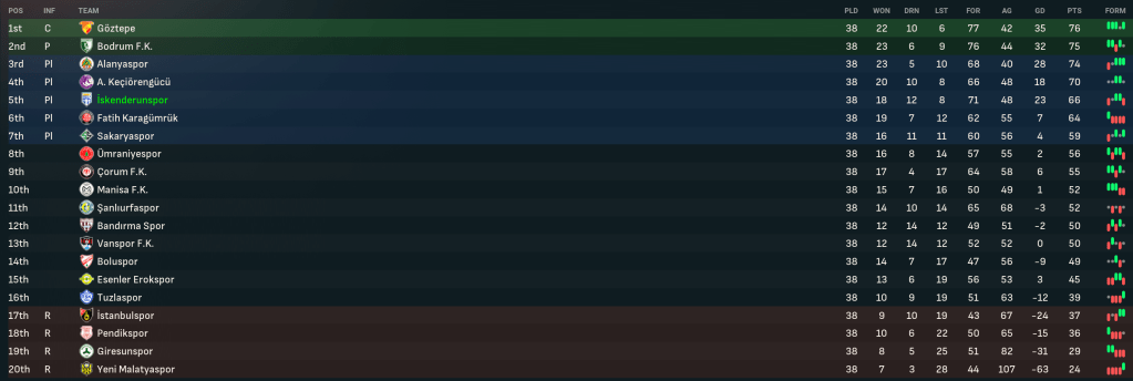 The unlikely promotion push continued by putting four past bottom-side Yeni Matalyaspor, in which Ahmet ended his 18-game goal drought. A mass of injuries, including a significant one for goalkeeper Tuncer, saw form dip through March and April, but Ískenderunspor remained right in the playoff and, probably less likely, the promotion mix. They found themselves 6th with four games remaining, nine points clear of 8th and seven points off the automatic promotion places.