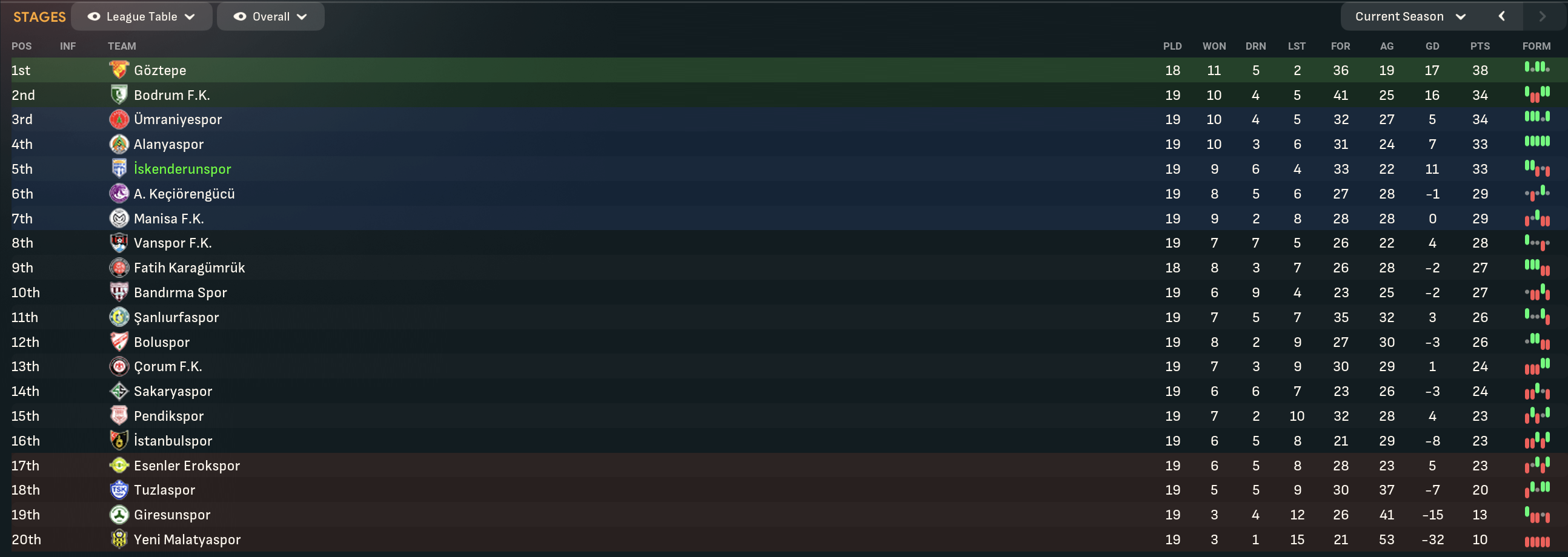 A major beneficiary of the tactical switch had been 22-year-old Göktan, who scored a 30-yarder to edge a 1-0 win at home to Sanliurfaspor. That was part of an eight-game unbeaten streak that ended with a 3-1 loss at Istanbulspor in mid-December. But Ískenderunspor still went into a 21-day winter break sitting pretty in 5th place on 33 points, with any relegation concerns long forgotten about.