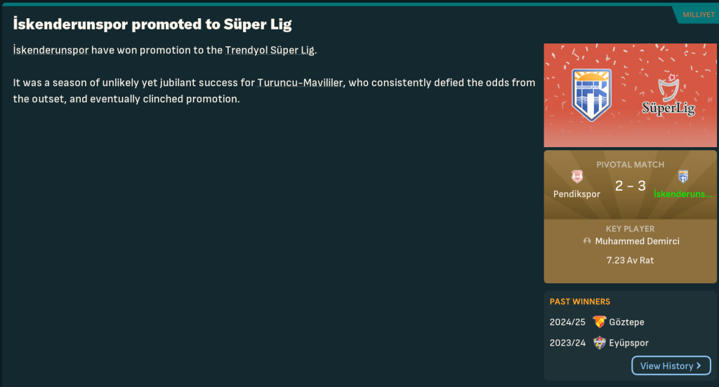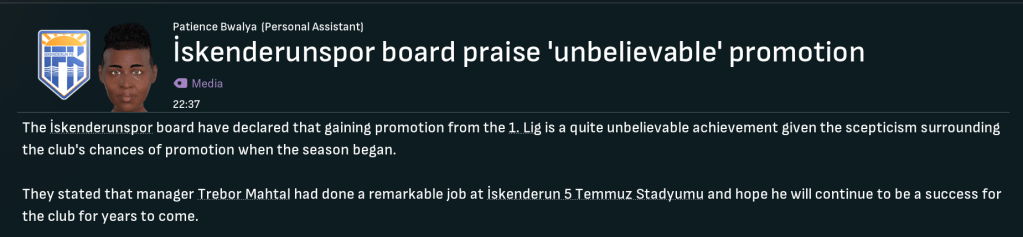 A massive task now awaited Mahtal as he faced up to the prospect of leading his Ískenderunspor into the Turkish top tier after just two years as a Football Manager. But would his achievements lead to more interest from other clubs? Join us on Monday to find out!