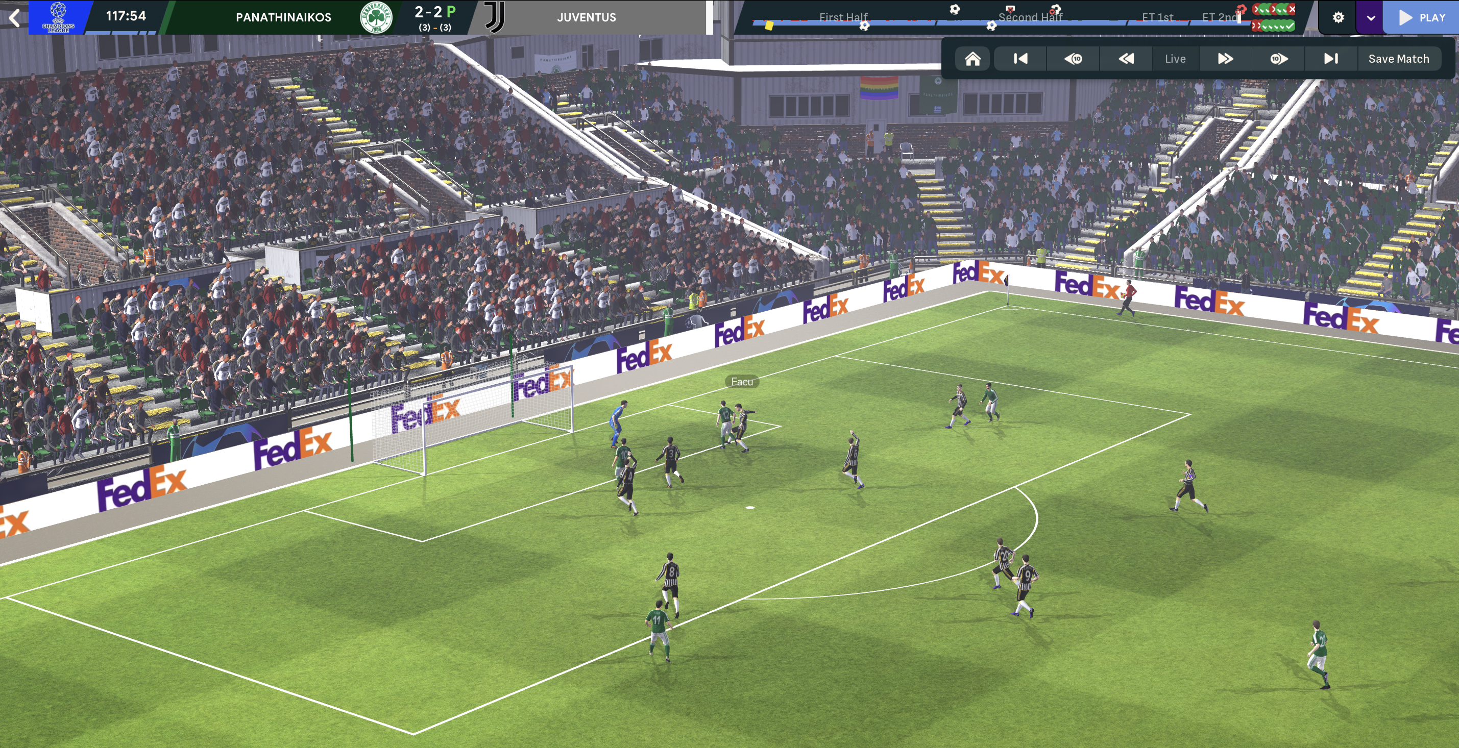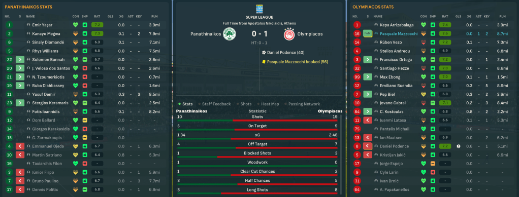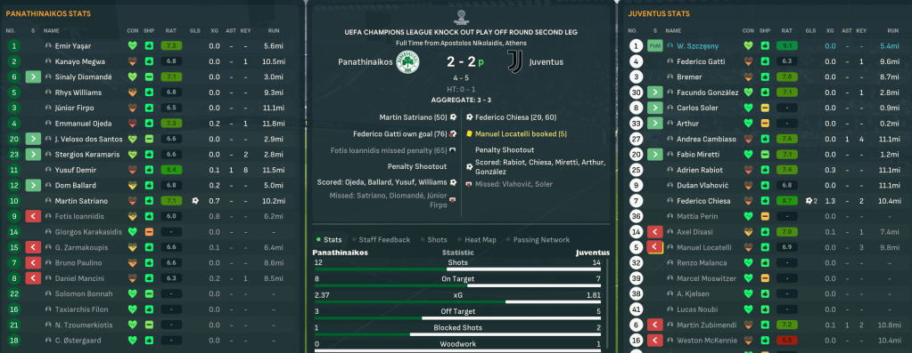 Everyone, Mahtal included, expected the run to end there as they took on Juventus. But Satriano’s goal earned a 1-1 in Turin to give them a chance in Mahtal’s 100th game at the club. Two pieces of terrible defending saw Juve gift Panathinaikos equalisers to a Chiesa brace. That took the game to extra time and a massive conspiracy arose as Satriano scored a 118th-minute and was clearly onside (he’s in the middle of the goal standing behind Ballard when he shoots in the screenshot below). A VAR check glitched and the result showed 3-2 as the game ended… but it suddenly went to a penalty shootout. Emir saved Juve’s first two but Ioannidis also missed and Sanali Diomandé missed their fourth. So it went to sudden death and, unsurprisingly, the nervous Firpo smashed one straight at Szesczeny.